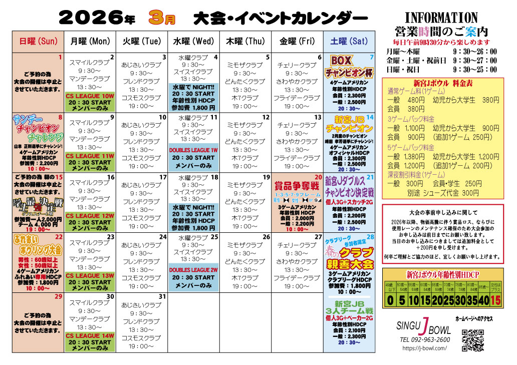 新宮Jボウルの2026年3月度スケジュールを更新致します。