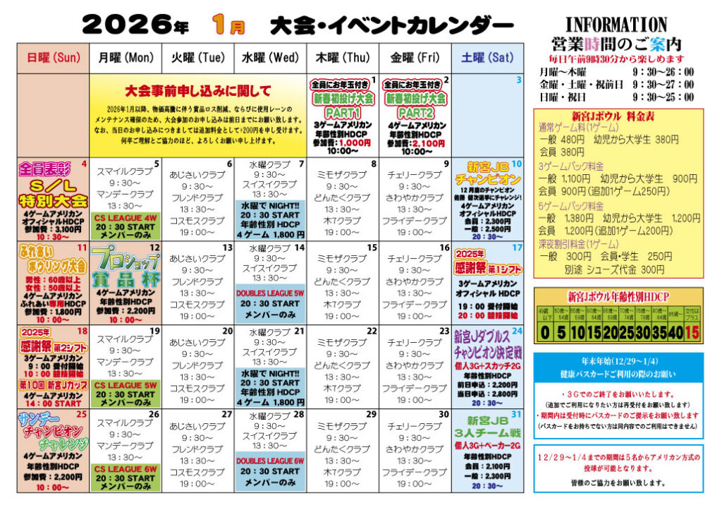 新宮Jボウルの2026年1月度スケジュールを更新致します。